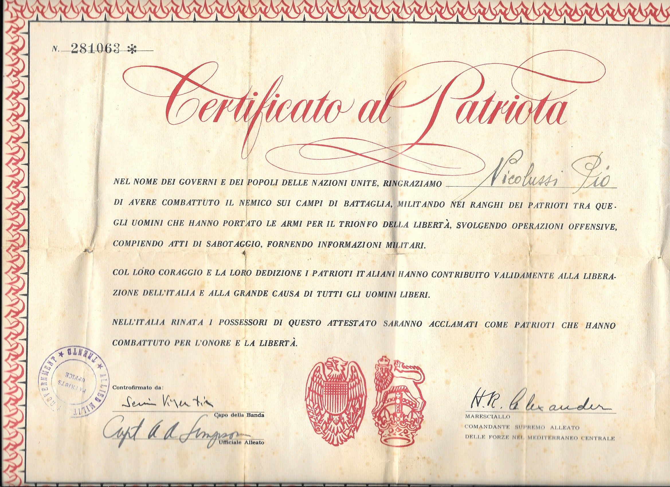 Il Certificato sotto è un attestato di gratitudine e riconoscenza rilasciato a Pio Nicolussi di Daniele per aver salvato l'aviatote Lee Palser nel 1944 dalla cattura del nemico.
